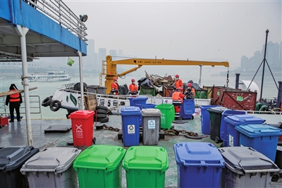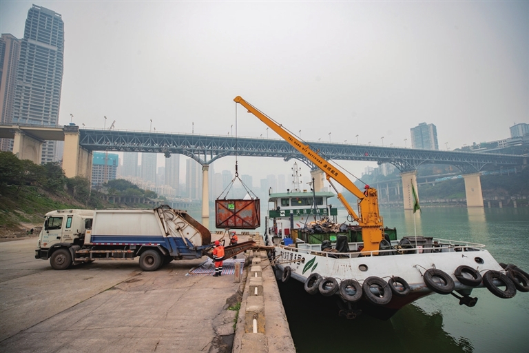 清晨的薄雾逐渐散去,水域环境5号废弃物接收船缓缓而行,一路收集沿途船舶的生活垃圾,最终,满载一船的“收获”的接收船停靠在相国寺码头,进行水陆转运,将打捞的江面垃圾和回收的船舶废弃物转运到垃圾回收车上。