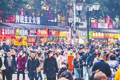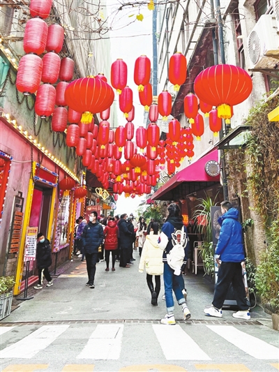 春节期间,山城巷内五彩灯笼高悬,街头巷尾装饰得喜气洋洋,各类文创店、小吃店门庭若市,年味浓厚。
