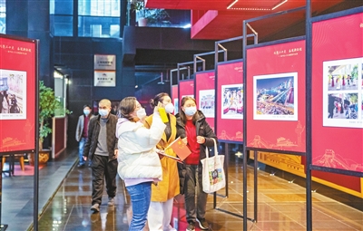 2月8日,一场学习宣传贯彻党的二十大精神文艺宣传主题演出吸引渝中社会各界人士走进重庆国泰艺术中心大剧院集体观演,同样吸引他们的,还有现场展出的“礼赞二十大 奋进新征程”渝中区人文主题摄影作品展。大家驻足在一张张摄影作品前认真欣赏,从镜头的光影中,感受渝中宜业宜居的幸福生活,体味“老重庆底片、新重庆客厅”的魅力神韵。