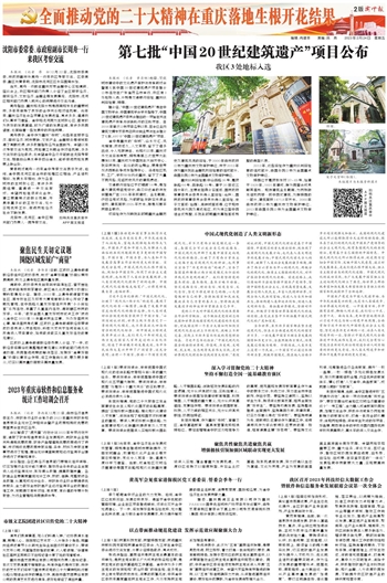 本报讯 (记者 黄清娴)近日,文化城市建设中的文化遗产保护与传承研讨会暨第七批中国20世纪建筑遗产项目推介公布活动在广东省茂名市举行,我区有3处地标入选,分别是交通银行旧址、重庆谈判旧址群、特园。