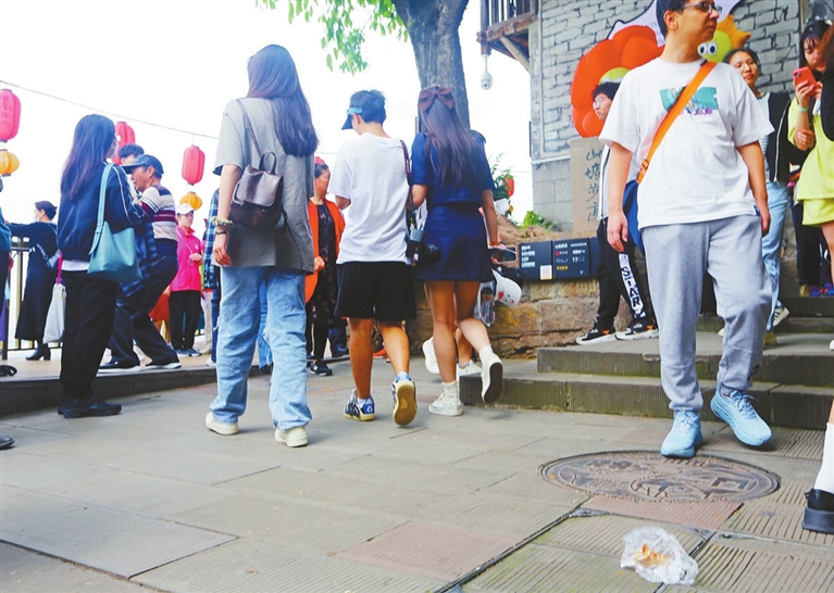 “五一”假期,记者在山城巷传统风貌区看到,不少游客携家人朋友一起前来游玩,在享受美景的同时,仍有个别不文明行为“煞风景”,如景区的地面零星散落着游客丢弃的零食包装袋、纸巾等垃圾,破坏了环境整洁。