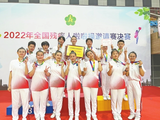 受疫情影响,2022年全国残疾人啦啦操邀请赛决赛延期至今年5月在重庆举行。在老师们的带领下,重庆市聋哑学校“梦之翼”啦啦操队14名队员克服重重困难,利用午休、放学、周末时间反复练习,直至熟练掌握每一个动作要领,用辛勤付出的汗水秀出青春舞姿。比赛现场,同学们动作整齐划一、节奏准确,情绪饱满、自信阳光,大家克服紧张情绪,努力把最好的状态、充满活力的舞姿呈现给观众和评委,最终以498分的全场最高分,获得听力残疾组自选动作第一名。