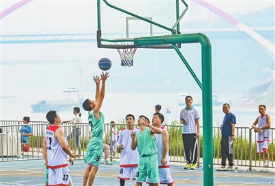 本报讯 (记者 李传芳)5月20日,清风徐徐的长江畔,初升的朝阳倾泻在“重庆最美江边篮球场”——黄沙溪江畔篮球场,“全民健身 活力菜街”菜园坝街道首届“社区杯”三人制篮球赛在这里火热开赛。由街道辖区企事业单位职工、居民代表组成的20支队伍100余人在球场上享受运动带来的快乐,长江边上呈现出一番“水畅、江清、岸绿、景美、人和”的景象。