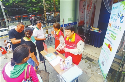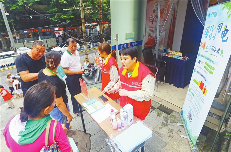 国网重庆市区供电公司渝中供电中心深入贯彻国家全面节约战略重要部署,充分利用网格管理机制,联合朝天门街道党群服务中心,开展“文明用电,科学节能”宣传,向朝天门片区的商户、居民宣传分时电价政策、“e起节电”活动,科普家电节电妙招,倡导广大居民节约用电。