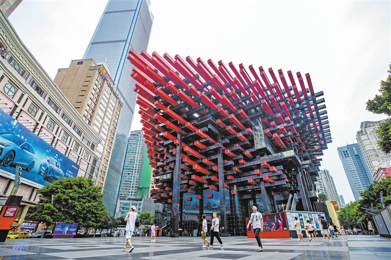 “这座建筑的灵感源自重庆穿斗老房,采用的红黑两色也颇有象征意义,代表着重庆人耿直、任劳任怨的性格特点。”范竞马说,“它也代表着重庆的‘都市篝火’‘艺术之火’,矗立在这里,点燃了整个解放碑,象征着重庆这座城市的繁荣。”