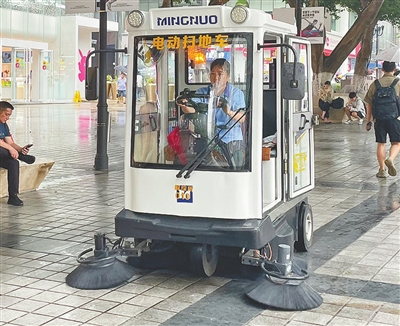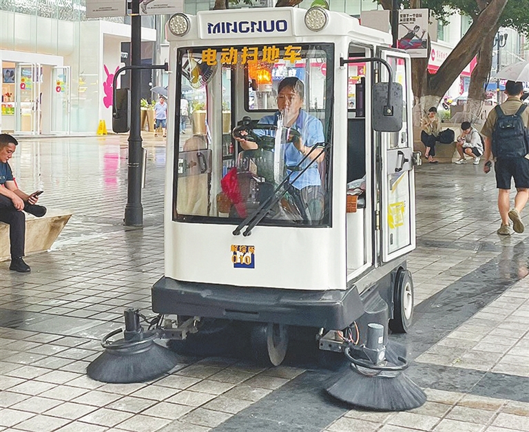 记者在解放碑步行街看到,环卫工人用警示牌拦出作业区域,高压冲洗车率先进场,工人用高压水枪对地面油污进行快速冲洗。为了防止因冲洗造成路面太过湿滑,清扫一体车紧接着上阵,对该处路面进行机械拖地,让路面保持干爽整洁。此外,当步行街的垃圾收运完成后,扫地车便及时“出马”,将垃圾桶周围渗出的垃圾进行清扫,不让垃圾收运造成二次污染。