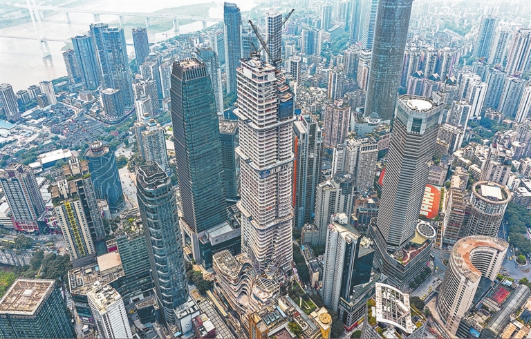 本报讯 (记者 廖 松)推进重点项目建设,渝中持续在行动。8月30日,记者从解放碑时尚文化城项目部获悉,在7月1日完成主体结构封顶后,项目在各方推动下持续加紧建设。截至目前,项目已完成主体工程屋面层结构施工,二次结构施工至L41层,抹灰施工至L15层。