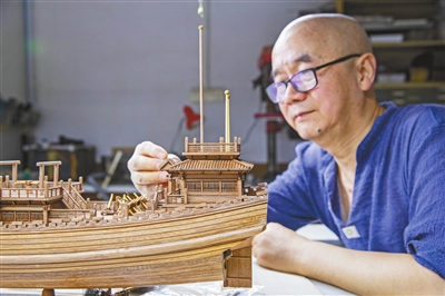 古船模型制作的环节分为制图、选料、开料、制作,每一环节都工序复杂。制图是基础,需提前查阅资料后,在图纸上按比例还原船只的历史样貌。选料是根本,纹路要均匀、硬度要适中、颜色要自然。开料是精髓,需根据基础图纸,将板材逐一切割、打磨成数以百计、千计、万计的小零件。制作是功夫,通过运用榫卯、镶嵌、粘接、穿斗等各种工艺,在“手尖上”完成,因为大多零部件过于细小。这差之毫厘、失之千里的功夫,讲究分寸,讲究精细,还讲究灵性。