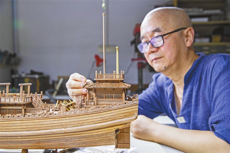 古船模型制作讲究精细复刻,一艘古船模型包含的零部件成千上万,大多以毫米为单位,有的还要精确到小数点后一位。比如窗棂最小的直径仅1毫米,榫、卯只有0.6毫米。虽然,周平东现在多用自制的机器切割、打磨,但也需要格外仔细,有时候为了一个0.6毫米的木料,要反复调试机器无数遍,要一遍又一遍切割一整个下午。“必须分毫不差!因为每个部件都是环环相扣的,一个小部件有误差,整个环节就要推翻重来。”周平东说。
