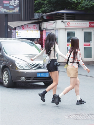 10月2日,在八一路好吃街路口,两名游客在车水马龙的道路上无视红绿灯和志愿者的劝导,执意横穿马路,既不文明,也不安全。