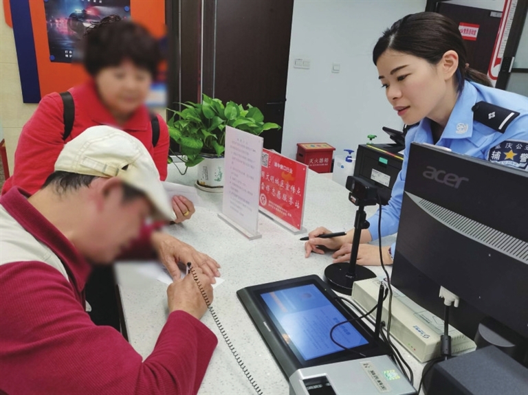 彼此清楚情况后,民警又轻轻拍了拍老人们的肩膀,意思是让他们放心。随后,有条不紊地开展起分工协助办证工作,有序引导老人来到两个绿色窗口办证,民警们耐心地用笔和老人们交流,手把手地教老人们拍照、采指纹、签名;遇到只有现金的老人,主动帮忙变换网络支付缴费;对已经办理过通行证的老人,另派专人带领持证至自助服务区办理签注;办理流程结束后,还细心询问老人是现场取证还是邮寄到家。
