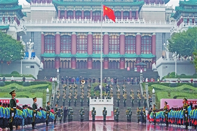 8时整,随着升旗台上擎旗手奋力挥动右臂,五星红旗随风展开缓缓升起,现场市民、游客肃立,向国旗行注目礼。