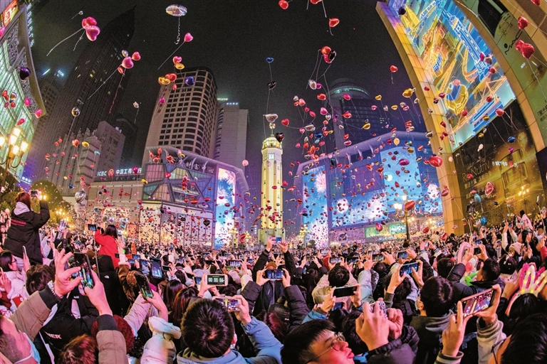 2023年12月31日晚,解放碑步行街人头攒动,市民、游客身着盛装聚集在此,欢声笑语迎接新年的到来。