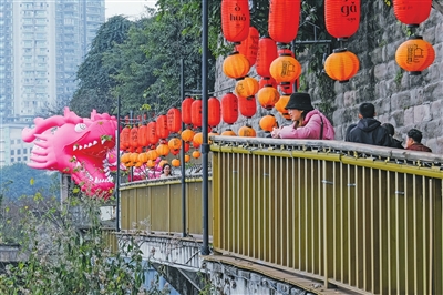 龙年元宵,怎能没有神龙?快看,除了各路“仙家”,一条身姿挺拔的粉色巨龙正蜿蜒盘旋于山城巷中。据悉,趣集5龙活动将持续开展至正月十五(2月24日),市民、游客可在山城巷各处找到龙头、龙身、龙尾,完成打卡,领取精美龙灯。
