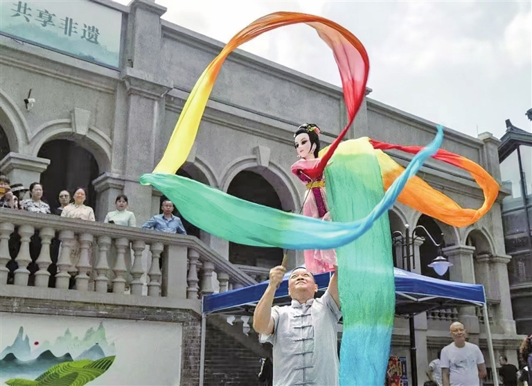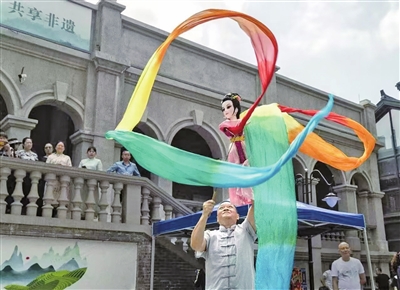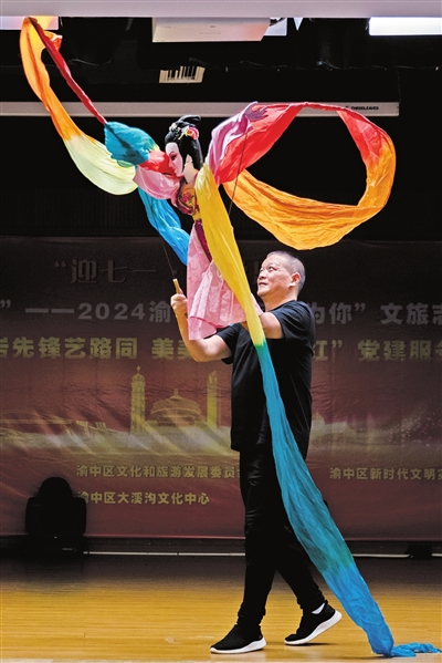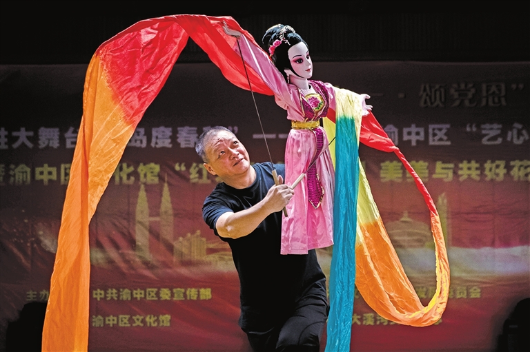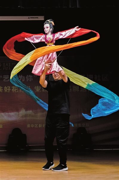 一众巴渝木偶中,要说最吸引人的,还属舞红绸的“嫦娥”,身姿轻盈,装扮灵动,特别是披在肩上的轻盈飘带,随着车渝江的小步快走摇曳摆动,果真就翩翩起舞了起来。“嫦娥”曾跟随着车渝江登上中央电视台综艺频道《舞蹈世界》栏目的舞台,也曾在解放碑CBD广场周末音乐会上亮相,还走进渝中多所中小学校园,让小小少年们感受非遗的魅力。