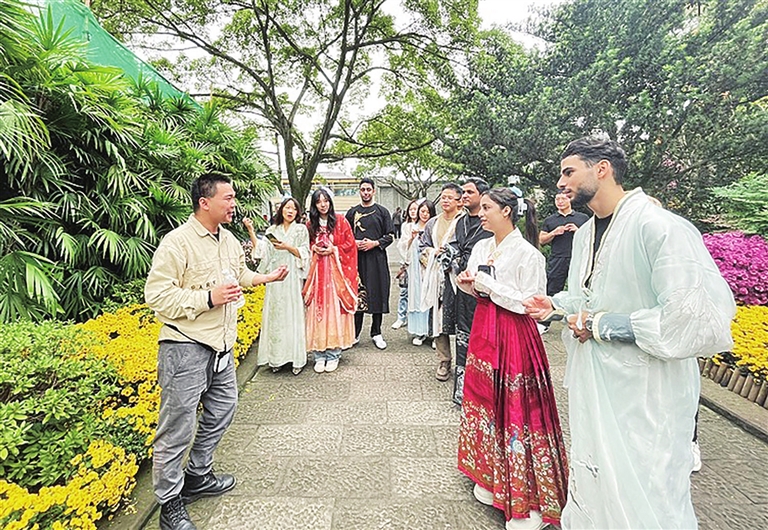 活动中,国际友人身着汉服,共读关于“菊花”的古诗词,品尝金丝黄菊茶,并走进园区欣赏各式各样的菊花,了解“菊”文化,亲身感受中华文化的独特魅力。