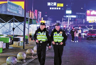 晚上9点,长江二路和泓江山国际旁夜市,街口警车静立、警灯闪烁,街区灯火通明、人声鼎沸。陈幼愚和陈东沿街步行,以“不打扰”的方式守护着温暖的城市烟火:“让大家知道我们一直在身边,这就是群众安心过年的底气。”