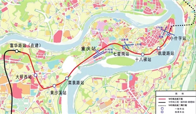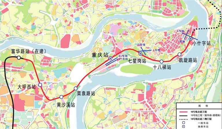 重庆轨道交通18号线北延工程全线位于渝中区,东起小什字站,西至富华路站(不含),途经重庆湖广会馆、凯旋路、十八梯、七星岗、菜园坝铁路枢纽、黄沙溪、龙湖重庆时代天街等地。