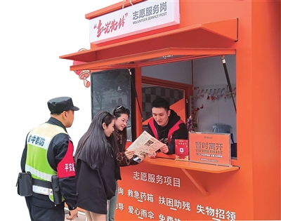 这里不仅是旅客的“临时服务站”,更是社区志愿者传递温暖的爱心港湾。不足10平方米的岗亭,便民药箱、充电设备、饮水机、爱心雨伞等物资一应俱全。“每天有众多游客经过,我们的服务必须跟得上需求。”两路口街道国际村社区党委书记唐坤蓉介绍,岗亭自今年初启用以来,已吸纳党员志愿者30名、群众志愿者28名,累计服务游客超5万人次。