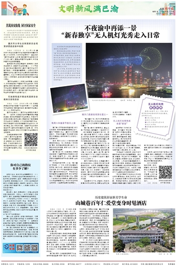 绚烂绽放的山茶花、年味十足的“春”字灯笼、惟妙惟肖的中欧班列……今年春节期间,由数千架无人机带来的灯光秀点亮了山城夜空,光与影倒映在波光粼粼的江面,在带来震撼视觉盛宴的同时,也为市民和游客送上新年祝福。而这“新春独享”的无人机灯光秀将走入日常。