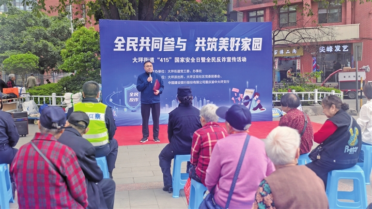 大坪街道联合大坪派出所、中国建设银行渝中大坪支行开展“4·15”国家安全日暨全民反诈宣传活动,通过节目表演、有奖问答、反诈宣传等形式,向广大群众开展国家安全教育,普及防范电信网络诈骗知识。