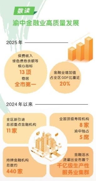 2025年,是成渝地区双城经济圈建设纵深推进的关键之年,也是西部金融中心建设“三年行动方案”的攻坚之年。作为重庆金融业底蕴最深厚、资源最富集、生态最优良的区域,渝中以“首善担当”扛起主承载区使命,金融业增加值占全区GDP比重近20%,保费收入、绿色债券余额等13项核心指标稳居全市第一。渝中正以“春山在望”的姿态,在建设西部金融中心主承载区的征程上奋楫争先,谱写金融赋能高质量发展新篇章。
