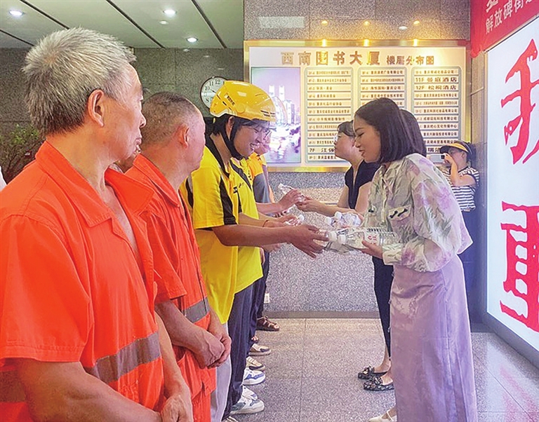 炎炎夏日,酷暑难耐。解放碑街道大井巷社区启动“夏日送清爽 关怀暖‘新’人”活动,为奔波在大街小巷的环卫工人、外卖小哥、快递员等户外劳动者、新就业群体送上清凉与关怀。