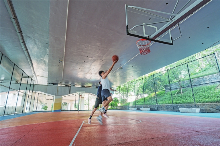从嘉华大桥桥下入口步入步道,最先打破“桥下=阴暗闲置”刻板印象的是一片充满活力的复合型运动场地。刚走近,篮球撞击地面的“砰砰”声便清晰传来,两名年轻人正在崭新的篮球场上激烈对抗,篮板上的篮网随着每一次投篮动作轻轻晃动,满是青春活力。