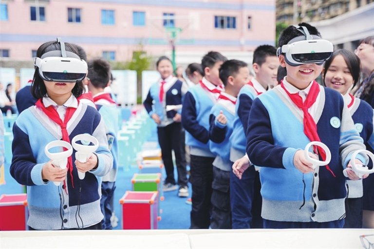 在“悦读趣玩·绘享时光”体验集市上,阅读变成了一场可感、可触、可玩的冒险。孩子们戴着VR眼镜“穿越时空”,亲手体验雕版印刷的奥秘,在“好书遇知音”换书驿站与同好相遇,在“盲盒挑战赛”中赢取各区县精心准备的阅读好礼。