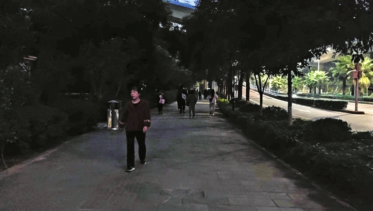 在化龙桥街道嘉博路社区轨道9号线化龙桥站通往嘉韵山水城的路上,随着天色渐暗,周围已华灯初上,而这段路却依旧昏暗。过路的居民告诉记者,这段长约800米的路上,没有一盏路灯,大家只有靠绿化带外侧和高处微弱的车道灯光行走,而道路两旁的行道树又十分茂盛,这些枝叶在白天是绿荫,到了晚上却成了“遮光板”,将高处的光线切割得支离破碎,在昏暗的道路上形成了许多视觉盲区。家住嘉韵山水城的佟阿姨告诉记者,每天晚饭后她要带5岁的小孙女出门散步,行经此路段时,非常担心孩子摔跤跌倒。