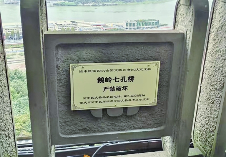 本报讯 (记者 黄清娴)近日,渝中市民发现,鹅岭七孔桥有了淡黄色的“身份证”,上面清晰标注了“严禁破坏”和区文物局举报电话,以及发证单位:重庆市渝中区第四次全国文物普查办公室。
