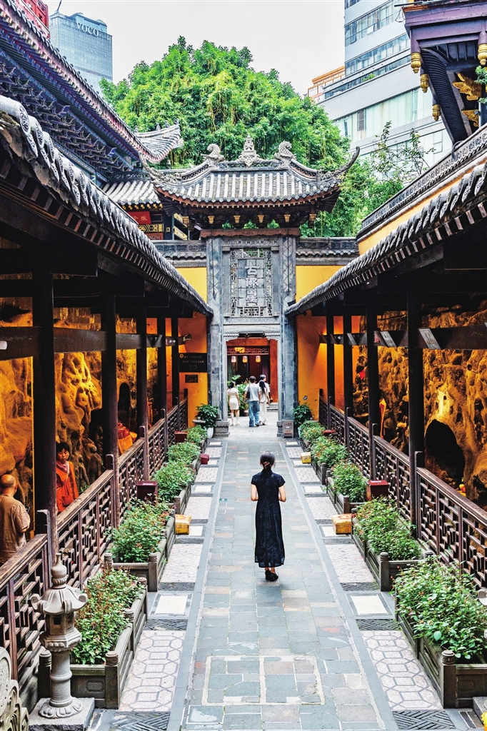山势错落的渝中半岛,是建筑最好的秀场:抬眼望去,飞檐斜挑,恰好与不远处的摩天楼、跨江桥形成美妙构图——灰瓦映着玻璃幕墙的流光,斗拱纹理叠着钢索桥的龙骨,传统建筑的古典与现代建筑的恢宏,在渝中半岛的天际线上达成奇妙共鸣。若是天公作美,站在檐下,观赏“指点檐牙高处,浪拥云浮”,与辛弃疾来一场穿越数百年的邂逅。