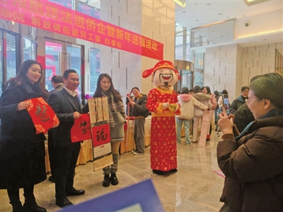 活动现场,来自区检察院的检察官耐心为侨企职工答疑解惑,细致解读侨务政策,耐心开展侨法知识宣传,让法治保障精准触达侨界群体。四位侨界书法家挥毫泼墨,一副副寓意吉祥的春联和一个个“福”字跃然纸上,引得大家争相领取。其间,物业工作人员还装扮成“财神玩偶”派送元宝,现场洋溢着欢声笑语,年味十足。“祝你新春快乐,财源滚滚来!”考虑到部分企业工作繁忙,主办方还组建了送“福”小分队,拿着“福”字、“元宝”深入企业,为职工们送上新春祝福。“太感谢你们了,借你吉言,希望新的一年大家都越来越好!”吉祥喜庆的氛围在你来我往中传递。